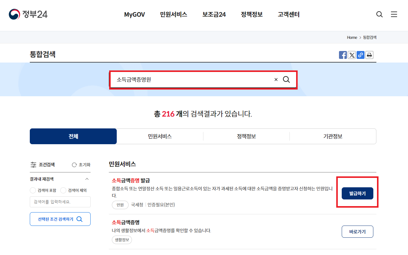 홈페이지 접속 후 통합 검색에 소득금액증명원으로 검색하시면 아래처럼 화면에 보여집니다.