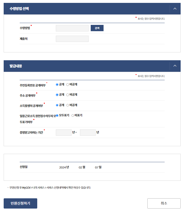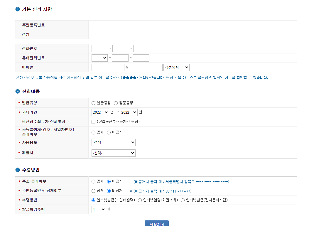 - 발급유형, 증명 구분, 과세 기간등 확인 후 [신청하기]