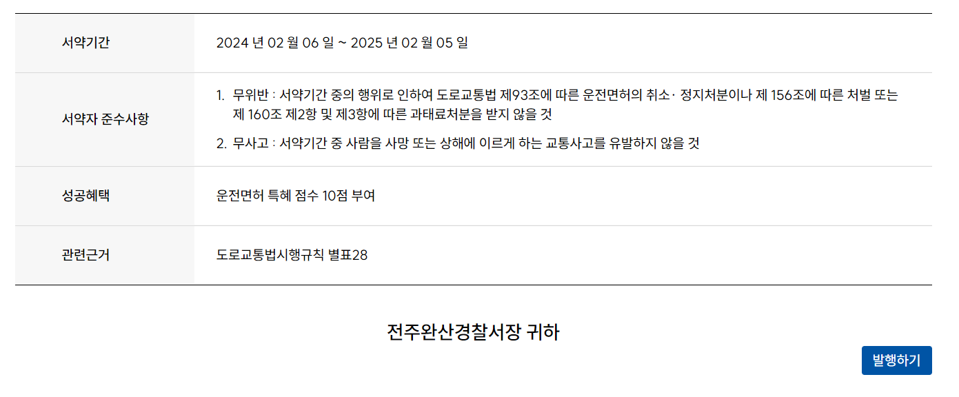 - 무위반 : 서약 기간 중 운전면허 취소 또는 정지 처분, 범칙금 통고 처분, 과태려 처분을 받지 않아야함