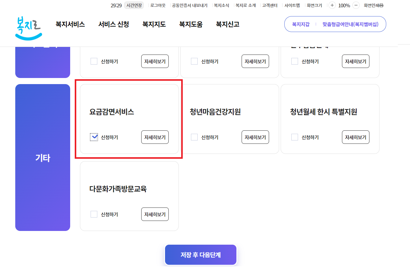 ✅ 복지로 홈페이지 접속 > 서비스 신청 > 간편인증 > 복지서비스 신청 > 복지급여 신청 > 기타 > 요금감면서비스